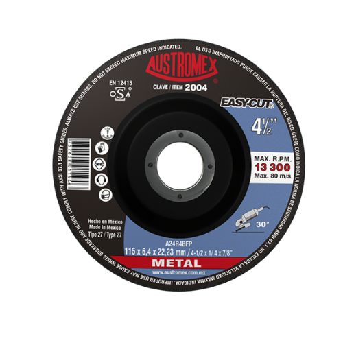 El disco Austromex AUS-2004 está diseñado para realizar cortes precisos y rápidos en metales ferrosos. Su composición abrasiva de alta calidad garantiza una excelente durabilidad y desempeño constante durante el trabajo. Es ideal para talleres, herrerías y aplicaciones industriales que requieren cortes limpios y eficientes. Compatible con esmeriladoras angulares de 4-1/2 pulgadas.