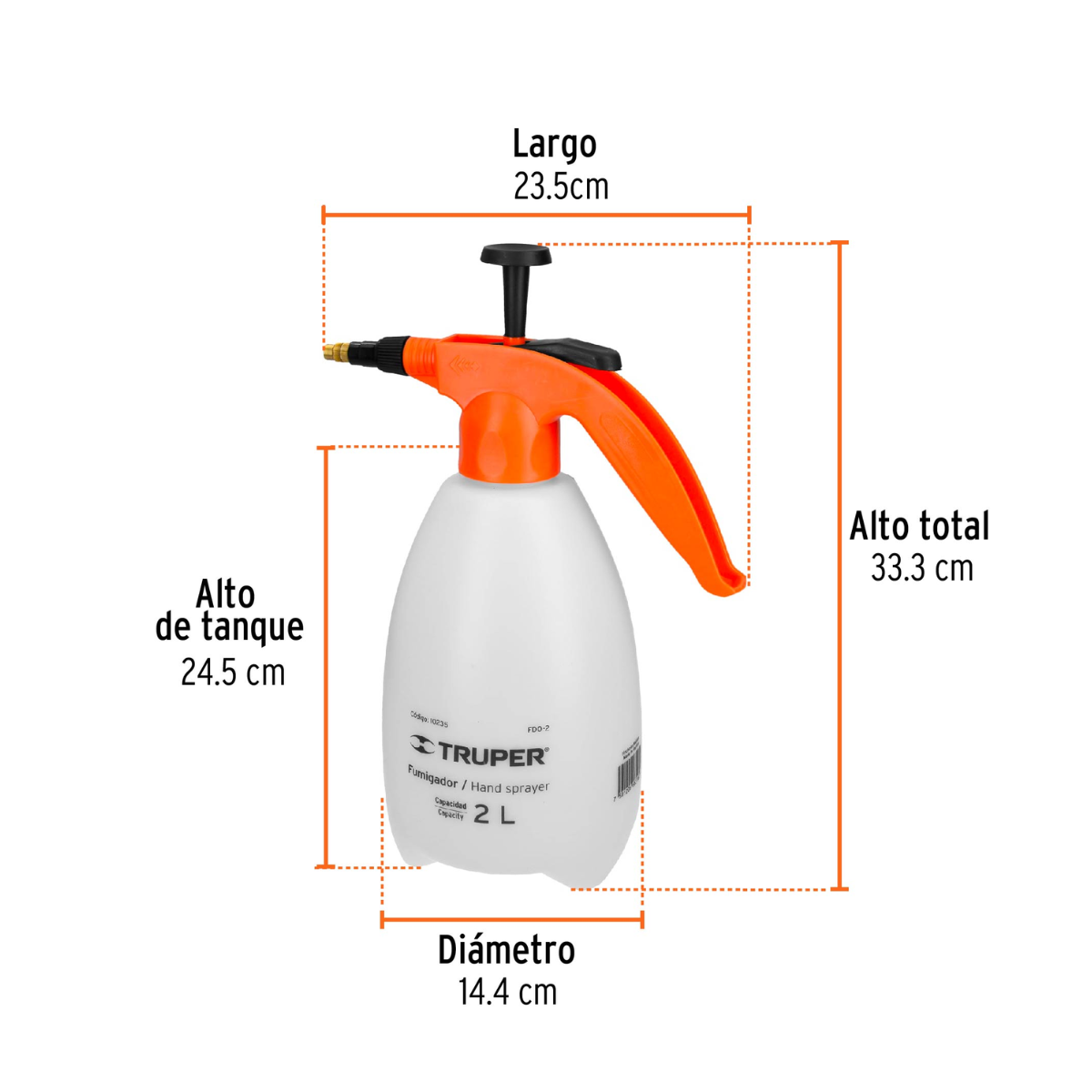 La fumigadora Truper FDO-2 es una herramienta práctica y confiable diseñada para la aplicación de insecticidas, herbicidas y fertilizantes líquidos en el hogar, jardín o pequeñas áreas de cultivo. Su tanque de 2 litros ofrece una capacidad adecuada para trabajos ligeros y de mantenimiento, permitiendo una operación cómoda sin agregar demasiado peso. Cuenta con un sistema de bombeo manual que genera la presión necesaria para una aspersión uniforme, además de una boquilla ajustable que permite regular el tipo de rocío dependiendo de la tarea. Su estructura está fabricada con materiales resistentes a sustancias químicas comunes, proporcionando durabilidad y un funcionamiento seguro. La Truper FDO-2 es ideal para usuarios que buscan una solución sencilla, eficiente y fácil de usar para el control de plagas y el cuidado de plantas.