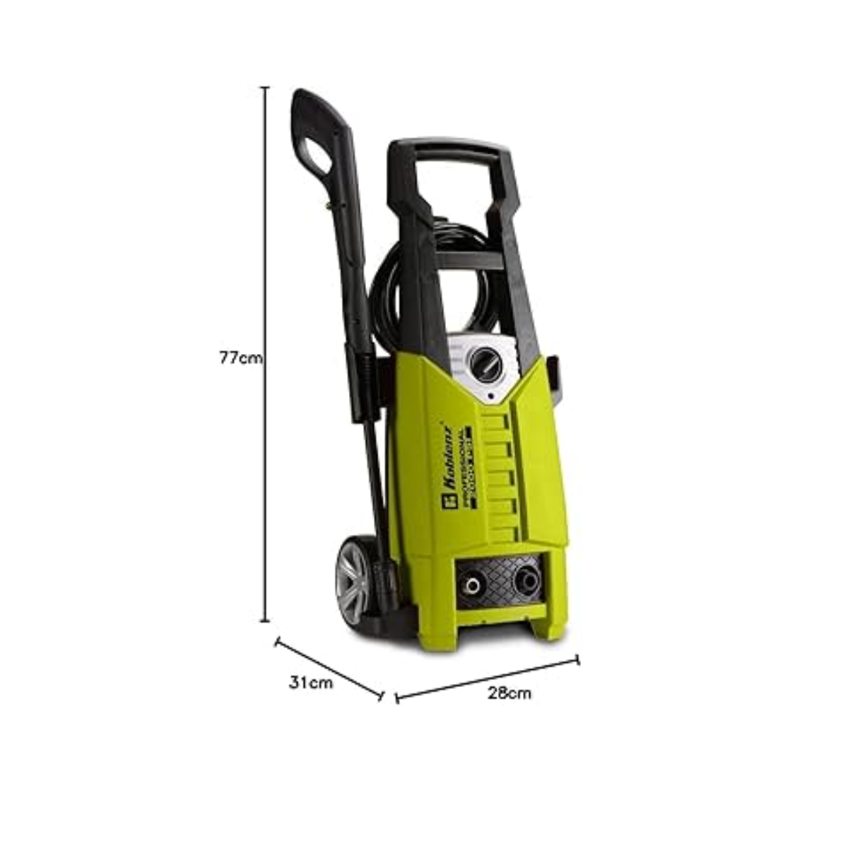 Su diseño incluye ruedas y mango ergonómico que permiten un traslado cómodo y un manejo sencillo durante el trabajo. La manguera de alta presión proporciona buen alcance y flexibilidad, mientras que los accesorios incluidos permiten adaptar el chorro de agua según la aplicación.