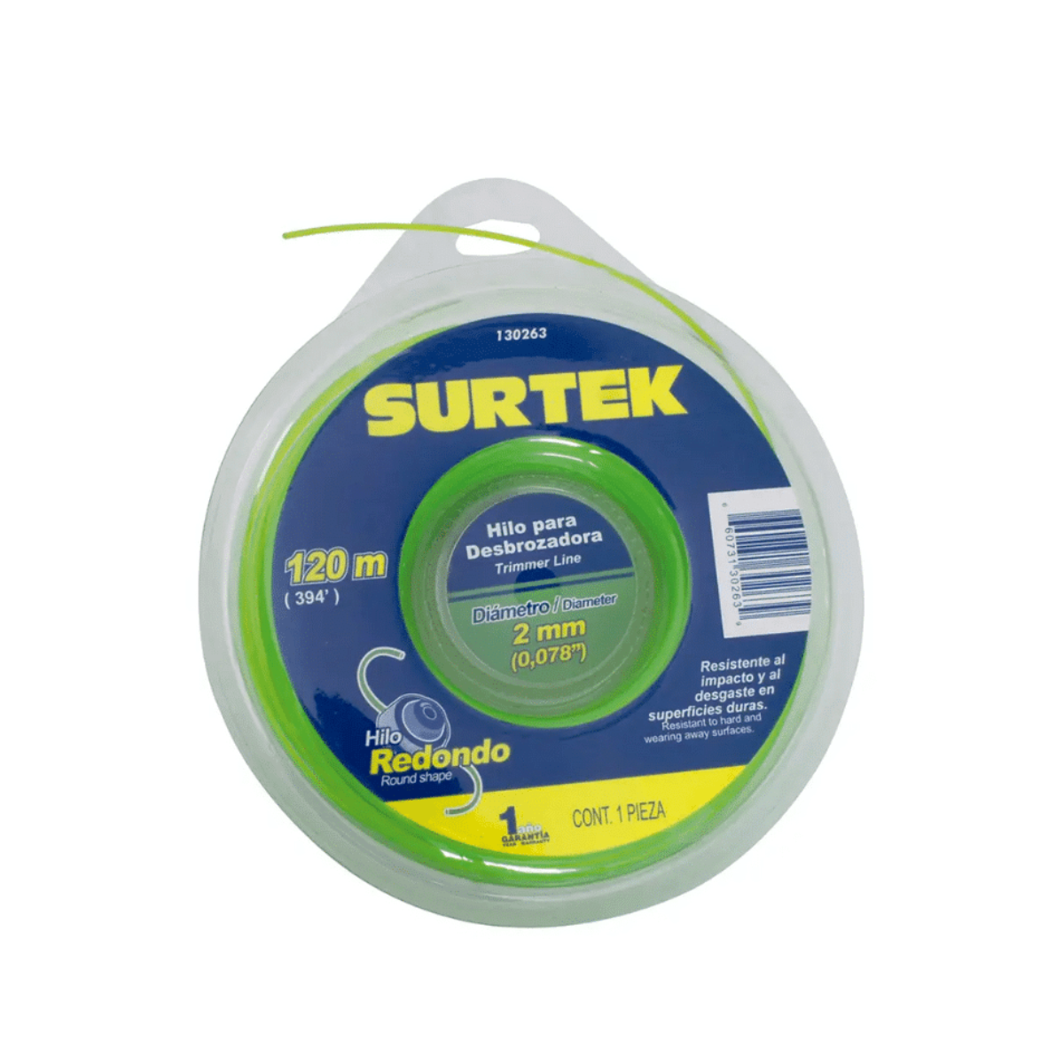 El hilo para desbrozadora Surtek 130263 de 2 mm color verde es un consumible resistente diseñado para cortar pasto y maleza de manera eficiente. Su diámetro de 2 mm proporciona un balance entre fuerza y flexibilidad, ideal para mantenimiento de jardines y áreas verdes. Compatible con desbrozadoras estándar, ofrece cortes limpios y duraderos en trabajos domésticos o profesionales.