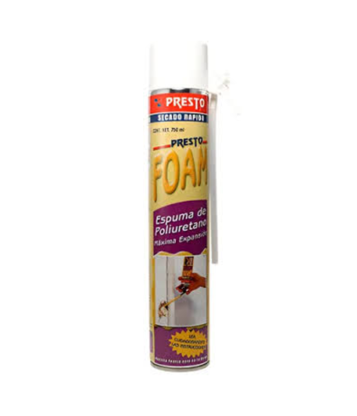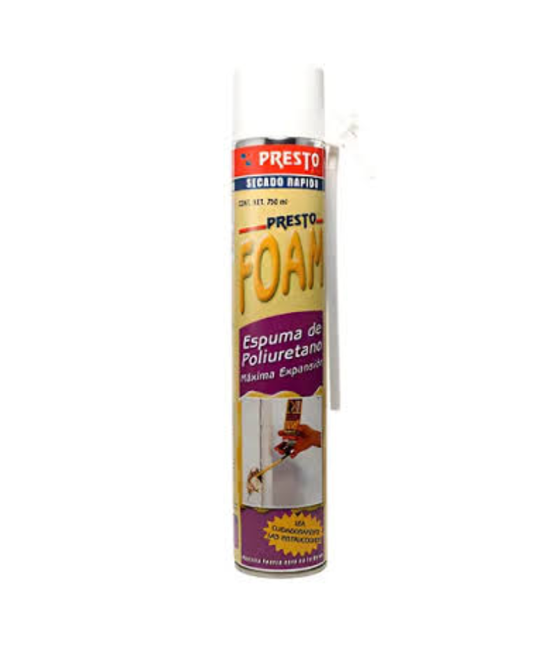 La Presto Foam 750 ml es una espuma de poliuretano monocomponente de aplicación sencilla, diseñada para ofrecer soluciones efectivas en aislamiento térmico y acústico. Su capacidad de expansión la hace ideal para rellenar huecos, sellar juntas y unir diversos materiales, garantizando una aplicación eficiente y duradera.